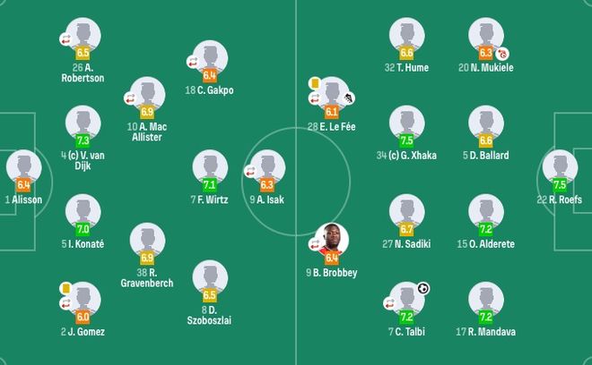 利物浦首发:1-阿利松、2-戈麦斯(65'17-琼斯)、4-范戴克、5-科纳特、26-罗伯逊(86'6-科尔克兹)、7-维尔茨、8-索博斯洛伊、10-麦卡利斯特(74'22-埃基蒂克)、38-赫拉芬贝赫、9-伊萨克(86'14-基耶萨)、18-加克波(46'11-萨拉赫)